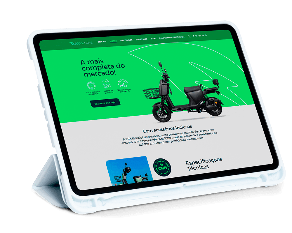 Criamos o site da Ecoolmove, especializada em veículos elétricos inovadores. A plataforma destaca a variedade de modelos disponíveis, incluindo opções para compra e locação, além de oferecer serviços de manutenção corretiva e revisões periódicas. Essa solução digital aprimorou a presença online da Ecoolmove, facilitando o acesso dos clientes a produtos e serviços sustentáveis e de alta qualidade.